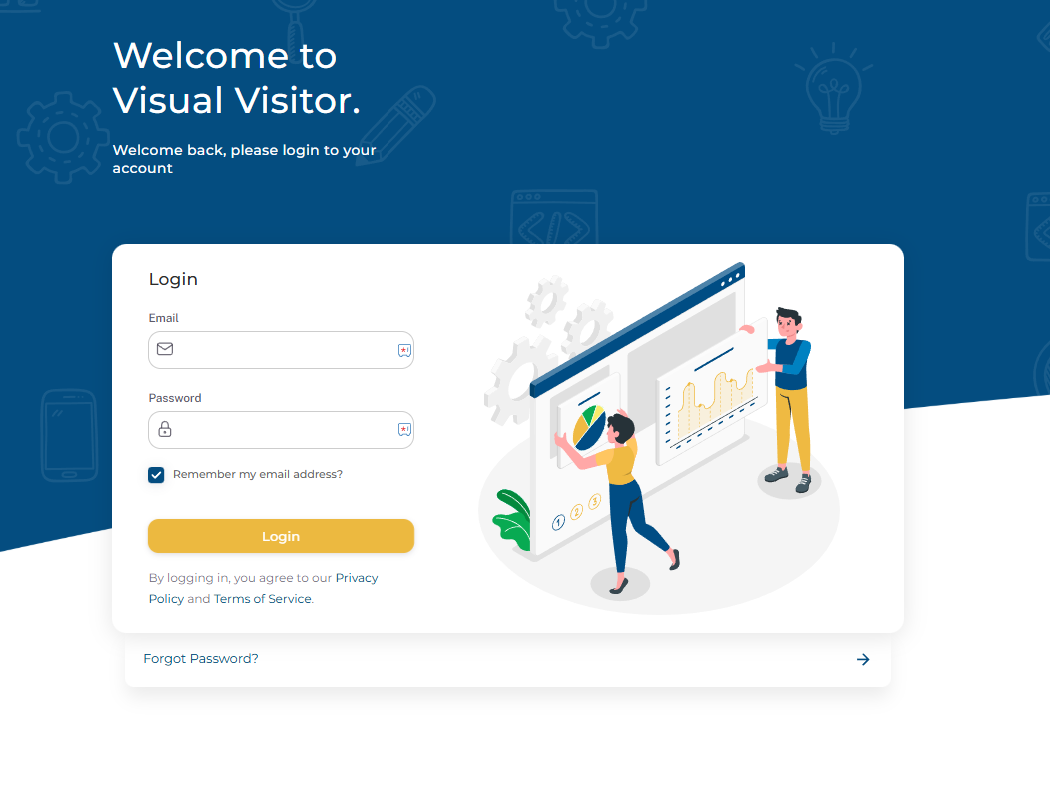 How Do I Log Into My Visual Visitor Dashboard? Logging into Visual Visitor is easy as 1. 2. 3. Go to your app.visualvisitor.com link Type in your Email and Password Select 'Login' You are in. Forgot or want to change your password? Click here to ...