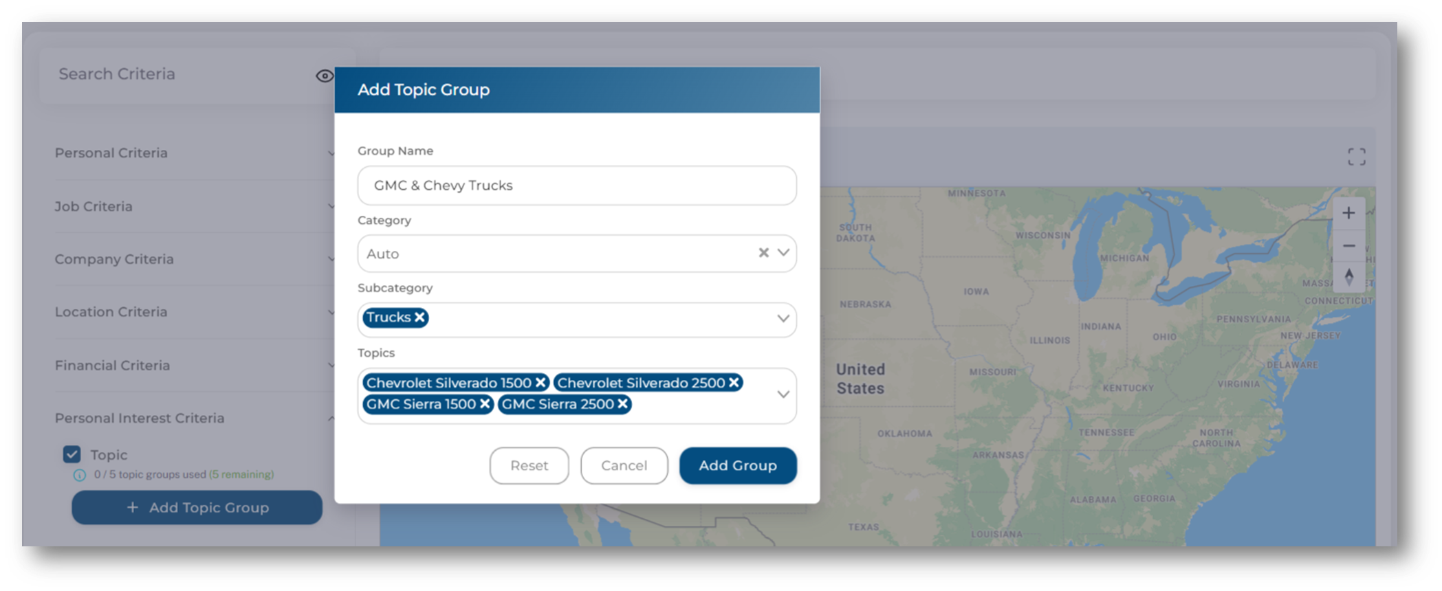 Begin by selecting your Interest Criteria — this determines the topics your audience is actively researching or engaging with.