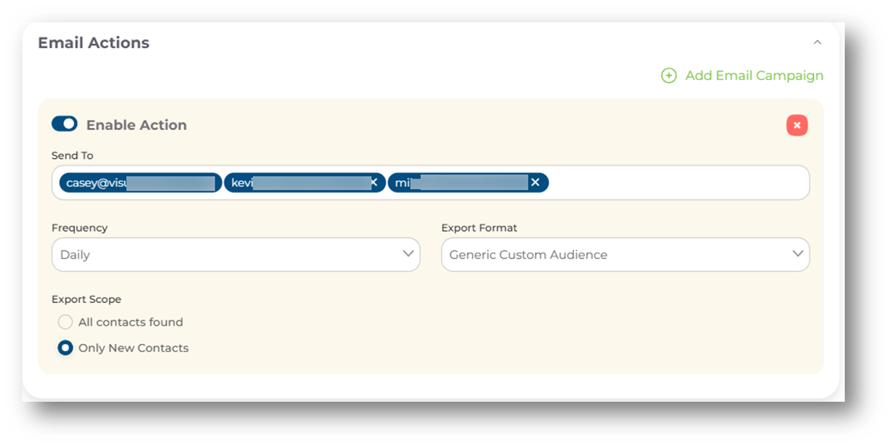 You can choose to send campaign data via email or export it directly to ad platforms such as Meta (Facebook) or Google Ads.