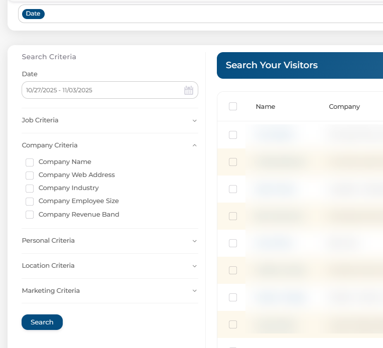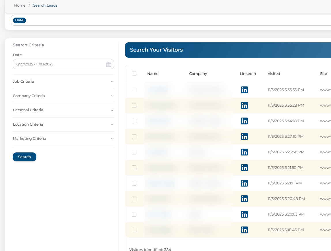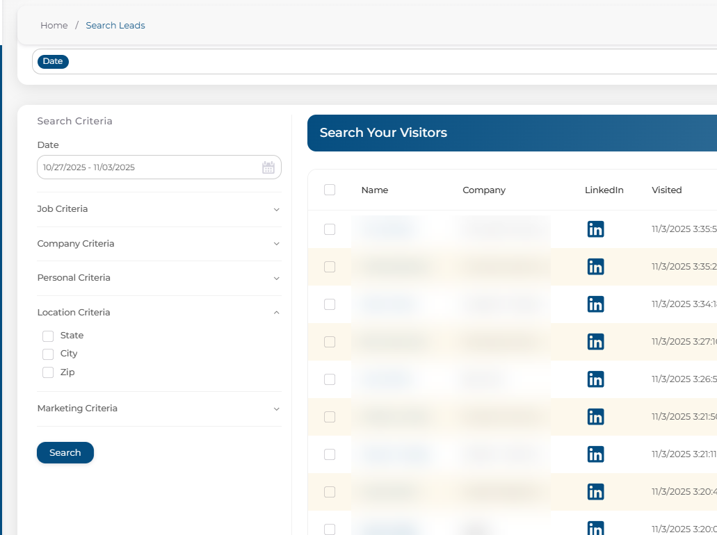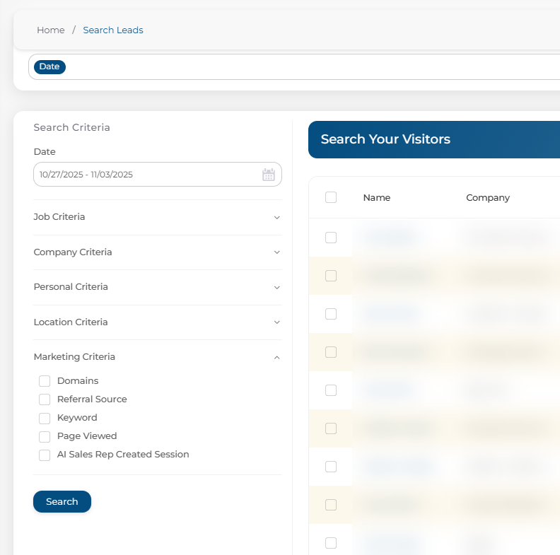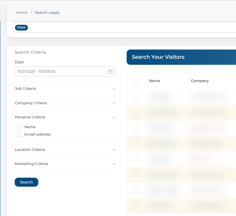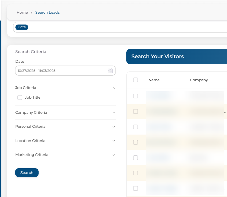 Adjusting your filters—such as date range, company name, or other search criteria will update the list of leads shown. Once your filters are set, click Search to refresh and view the updated results.